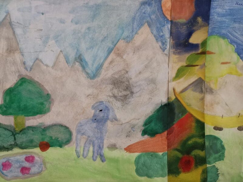 Im praktischen Teil entwickelten die Schüler*innen einen Bildausschnitt von Franz Marc auf einem A3-Blatt weiter und gestalteten ein eigenes, abstraktes Kunstwerk. Sie arbeiteten mit Formen, Linien und bewussten Farbkontrasten wie Komplementär-, Warm-Kalt- und Hell-Dunkel-Kontrast und setzten dabei ihre Deckfarben kreativ ein.