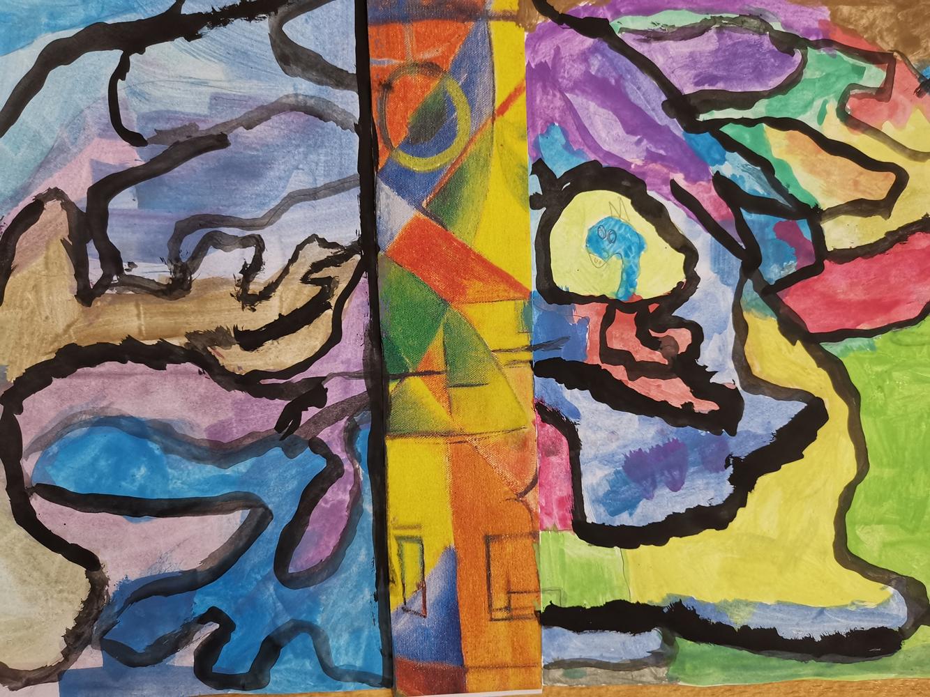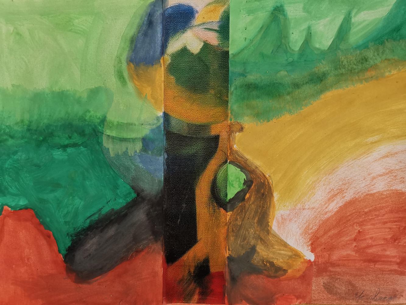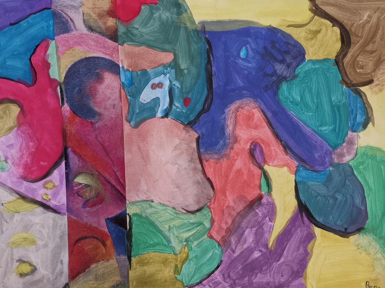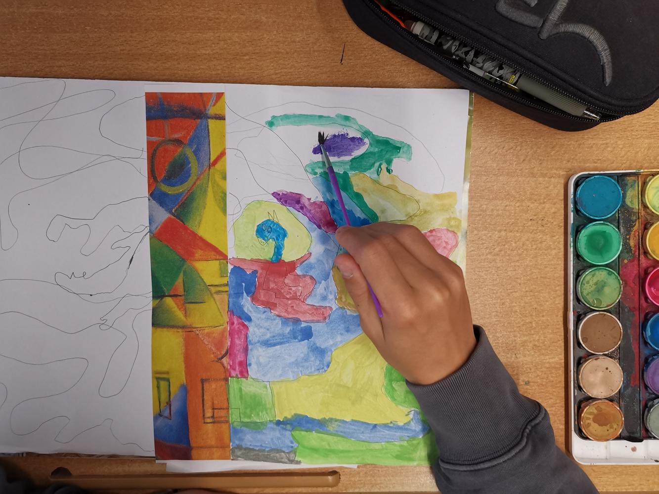 Im praktischen Teil entwickelten die Schüler*innen einen Bildausschnitt von Franz Marc auf einem A3-Blatt weiter und gestalteten ein eigenes, abstraktes Kunstwerk. Sie arbeiteten mit Formen, Linien und bewussten Farbkontrasten wie Komplementär-, Warm-Kalt- und Hell-Dunkel-Kontrast und setzten dabei ihre Deckfarben kreativ ein.