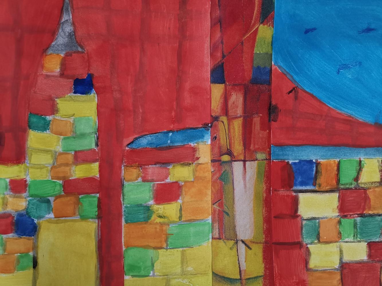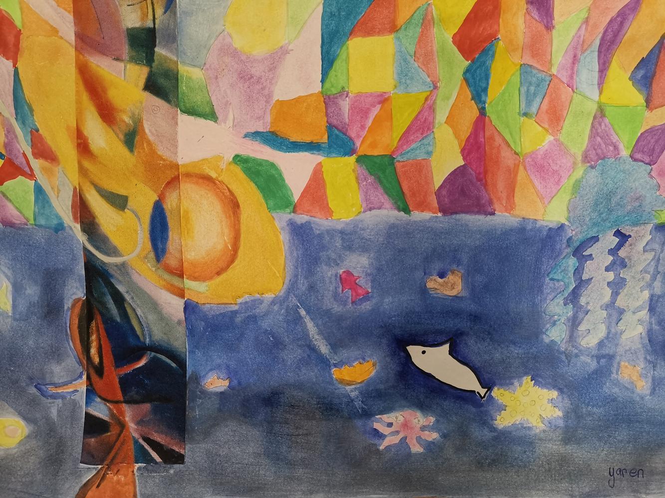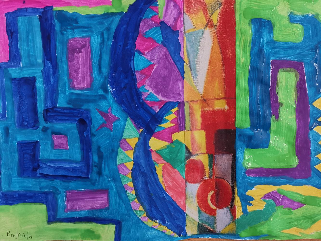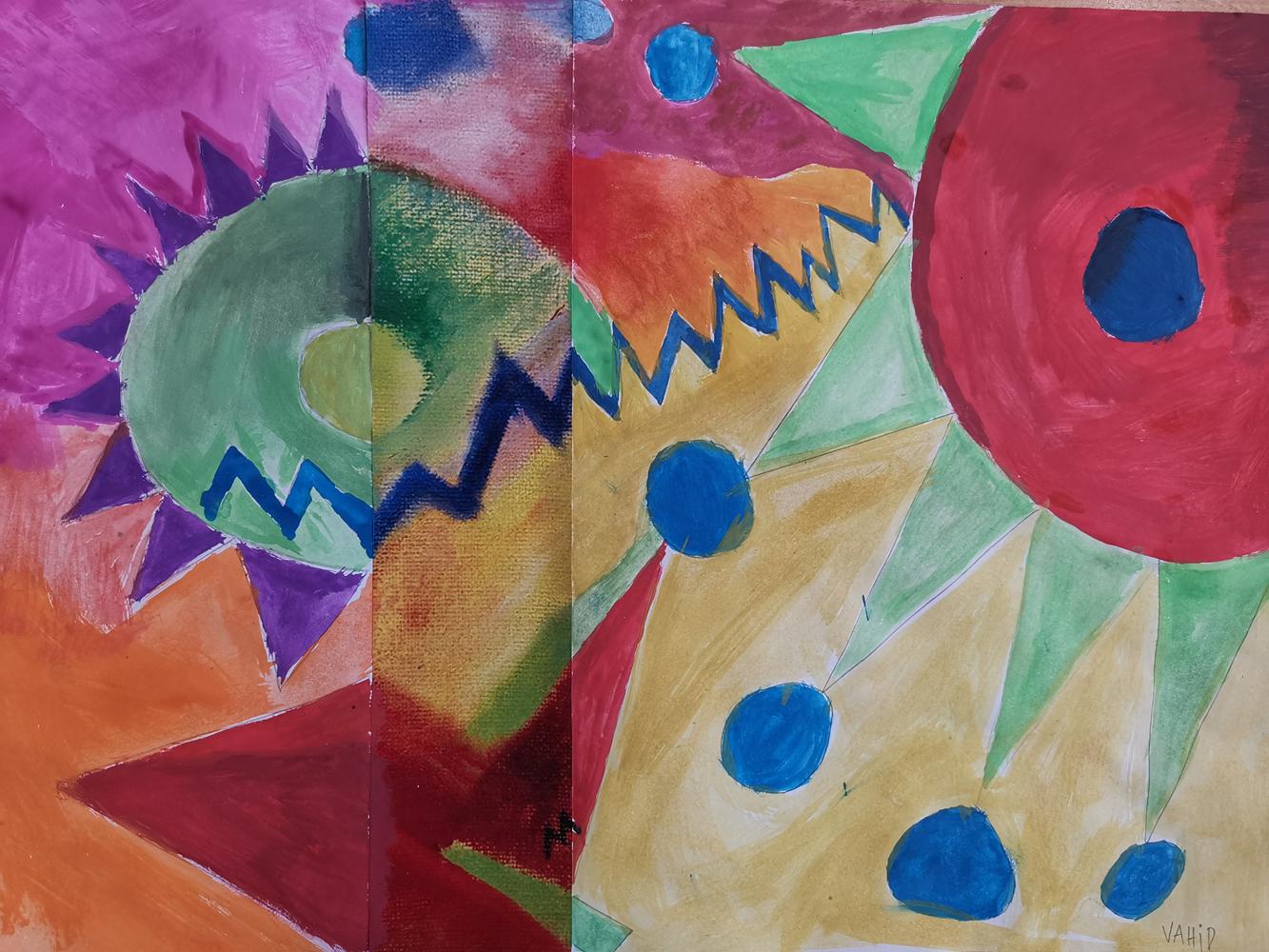 Im praktischen Teil entwickelten die Schüler*innen einen Bildausschnitt von Franz Marc auf einem A3-Blatt weiter und gestalteten ein eigenes, abstraktes Kunstwerk. Sie arbeiteten mit Formen, Linien und bewussten Farbkontrasten wie Komplementär-, Warm-Kalt- und Hell-Dunkel-Kontrast und setzten dabei ihre Deckfarben kreativ ein.