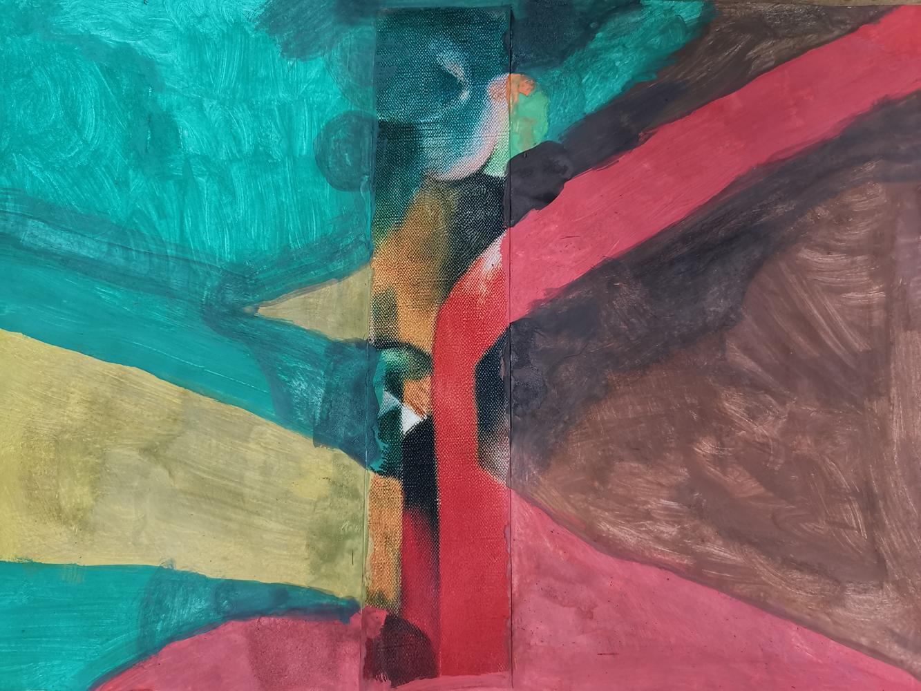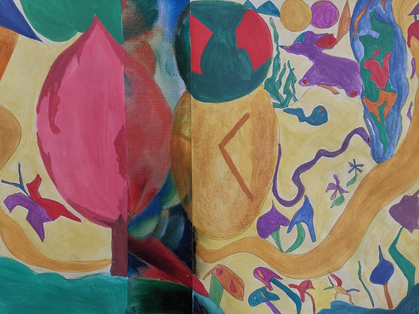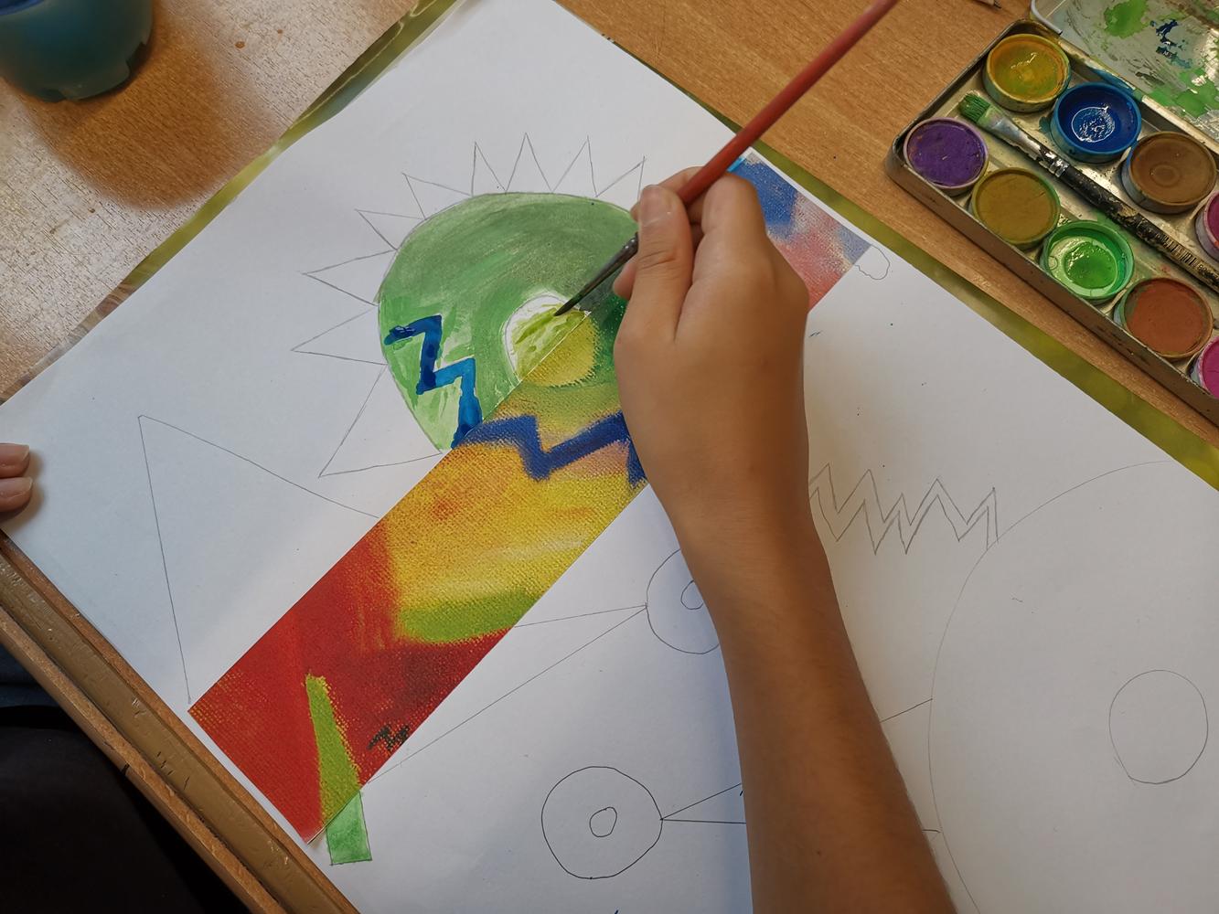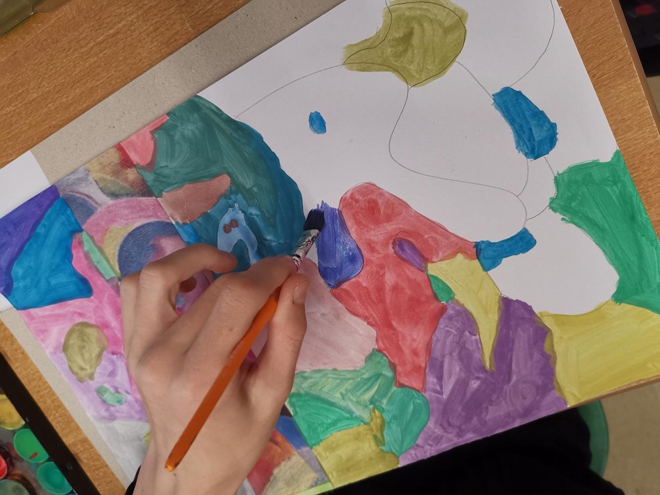 Im praktischen Teil entwickelten die Schüler*innen einen Bildausschnitt von Franz Marc auf einem A3-Blatt weiter und gestalteten ein eigenes, abstraktes Kunstwerk. Sie arbeiteten mit Formen, Linien und bewussten Farbkontrasten wie Komplementär-, Warm-Kalt- und Hell-Dunkel-Kontrast und setzten dabei ihre Deckfarben kreativ ein.